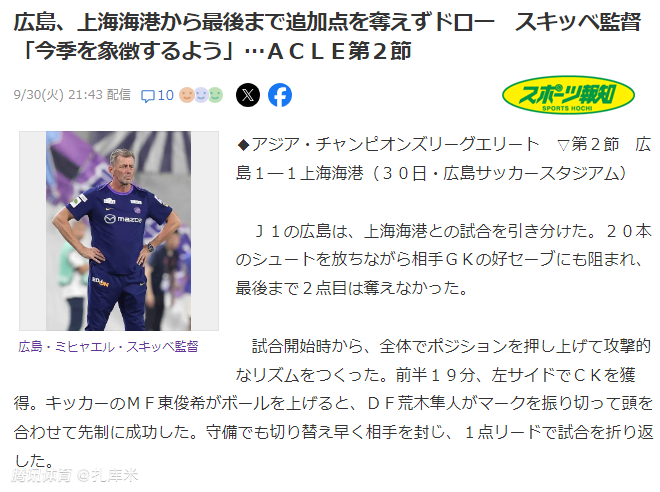 2025-09-30 21:50亚冠精英联赛东亚区第2轮比赛,广岛三箭主场1-1战平上海海港。赛后,广岛三箭主帅斯基贝表示,自己不满意球队战平海港,未能将优势转化为胜势,而且对手一次反击就打入了扳平球。