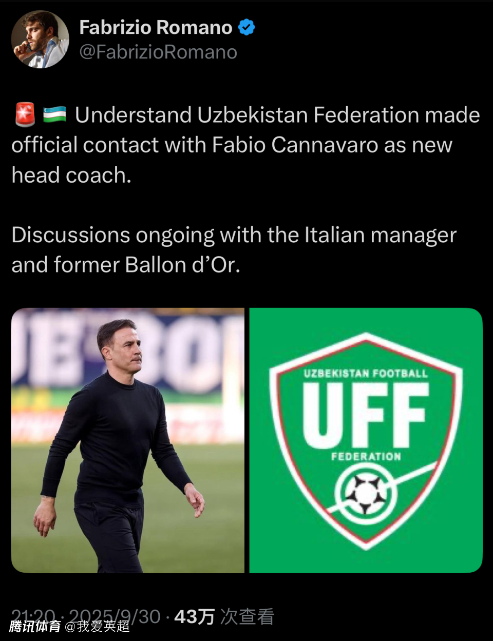 2025-09-30 23:00北京时间9月30日晚,知名记者罗马诺确认,乌兹别克斯坦足协已正式与卡纳瓦罗接触谈执教事宜。这位52岁的前恒大功勋主帅,极有可能因此无缘执教国足。