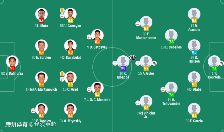 皇马首发:1-库尔图瓦、17-阿森西奥、24-赫伊森、4-阿拉巴、20-弗兰-加西亚、14-楚阿梅尼(80'6-卡马文加)、19-塞瓦略斯、15-居莱尔(80'5-贝林厄姆、30-马斯坦托诺(70'21-迪亚斯)、7-维尼修斯(70'11-罗德里戈)、10-姆巴佩(81'16-贡萨洛-加西亚)