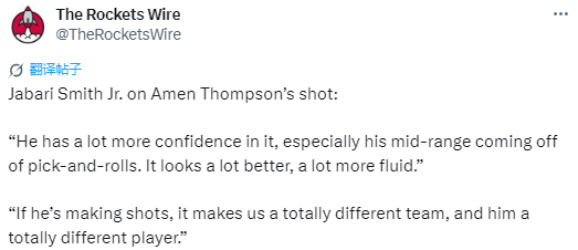 2025-10-01 07:00北京时间10月1日,火箭球员小贾巴里-史密斯在球队训练结束后接受媒体采访,谈及队友阿门-汤普森的投篮表现。