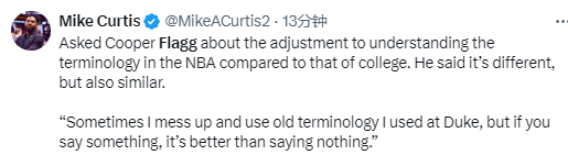 这位新秀承认,自己偶尔还是会不小心用上在杜克大学时的旧术语,但他表示,无论用何种方式,学会沟通才是最重要的。“虽然术语有差异,但归根结底都是一回事,你只需要慢慢习惯用不同的说法来表达。有时候我会犯错,说出杜克时期的旧术语,但我觉得,开口表达总比什么都不说要好。”