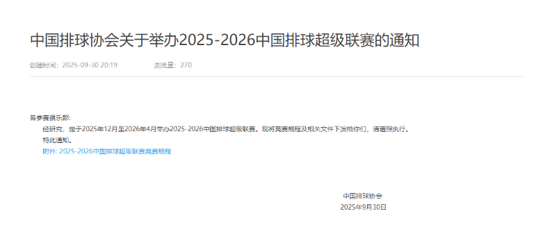 中国排协发布《关于举办2025-2026》中国排球超级联赛的通知