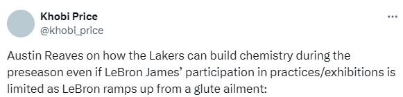 “尽管詹姆斯目前暂时没有上场参与合练,但作为篮球史上球商最高的球员之一,他要融入球队体系其实并不困难。他对比赛的理解能力,即便与联盟中的传奇球员相比也毫不逊色。就像我之前说的,我们会持续交流,不断交换关于如何使球队取得成功的想法,我认为这才是建立化学反应的核心所在。”