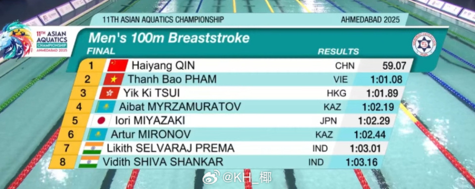 后半程也没有任何问题,整体节奏感无懈可击,差距拉到1个身位,以59秒07第一个触壁,这个成绩比世锦赛预赛高0.06秒。可以说,在亚锦赛蛙泳三个距离,成为了覃海洋的个人表演舞台。
