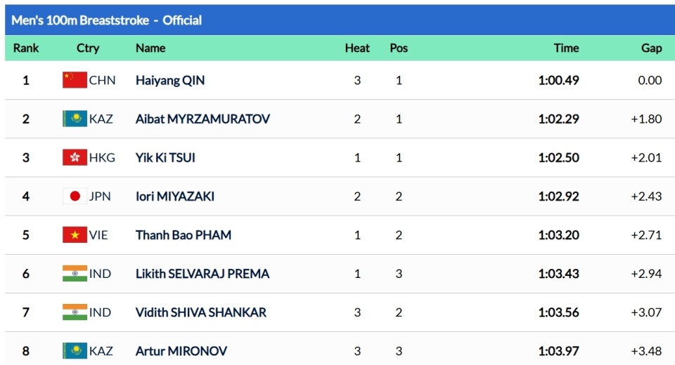 徐奕祺则在后半程被越南选手范青宝追上并反超,最终以1分01秒89摘铜,落后范青宝0.81秒。