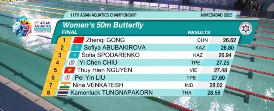 2025-10-01 10:30在印度艾哈迈达巴德进行的2025游泳亚锦赛女子50米蝶泳决赛里,龚真琦以26秒62夺得冠军!
