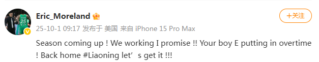 莫兰德写道:“新赛季即将开启,我们一定会全力以赴!你们的大莫正在‘加班’训练,我已经回到辽宁男篮大家庭了,一起加油吧!!!”