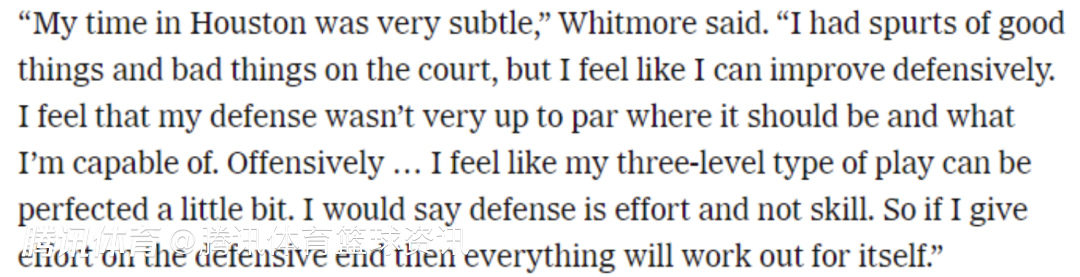 惠特莫尔表示:“我觉得自己每场比赛都该获得上场机会,但火箭队当时处于赢在当下的模式,乌度卡做出了他的选择。我在休斯顿的这段经历比较平淡,球场上我既有表现出色的高光时刻,也有不尽如人意的时候,但我知道自己在防守端还有提升空间。我觉得我的防守水平没达到应有的高度,也没发挥出自己的潜力。至于进攻端,我认为自己在篮下、中距离、三分线这三个得分区域的表现还能再精进一些。我一直觉得,防守靠的是态度而非单纯的技巧。所以只要我在防守端全力以赴,一切问题自然会迎刃而解。”
