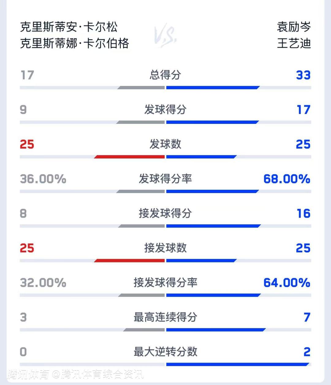 双方技术统计如下(袁励岑/王艺迪在前):总得分33-17、发球得分17-9、发球得分率68%-36%。