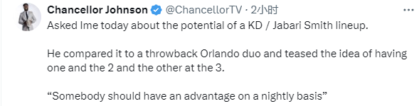 “过去几个月,小史密斯像海绵一样吸取经验,他与杜兰特进行了合练,学习技术。无论他今夏能否实现自我突破,我们都会考虑安排他们同时打3/4号位或2/3号位,让我们创造出对位优势。”