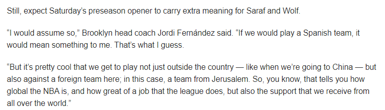 篮网队将在季前赛首战对阵耶路撒冷夏普尔队,而队内的本-萨拉夫和丹尼-沃尔夫都是以色列球员,费尔南德斯认为,这对于两人意义重大。“我认为会是这样,要是我们对阵的是一支西班牙球队,那对我来说也会意义非凡。我想情况就是如此。”