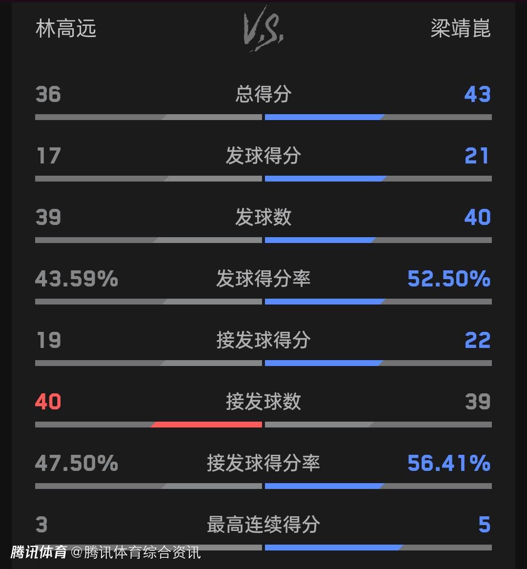 双方技术统计如下(梁靖崑在后):总得分36-43,发球得分17-21,发球得分率43.59%-52.50%
