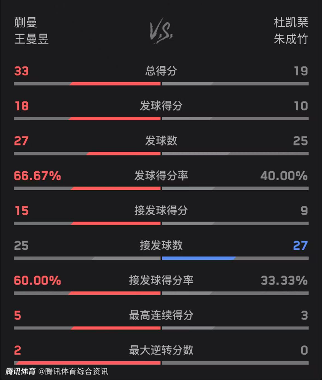 双方技术统计如下(王曼昱/蒯曼在前):总得分33-19、发球得分18-10、发球得分率66.67%-40%。