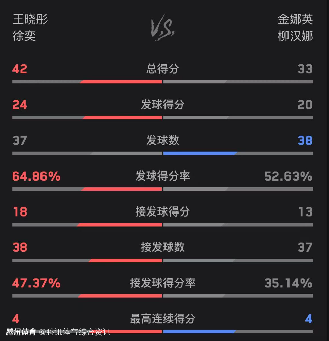双方技术统计如下(王晓彤/徐奕在前):总得分42-33、发球得分24-20、发球得分率64.86%-52.63%。
