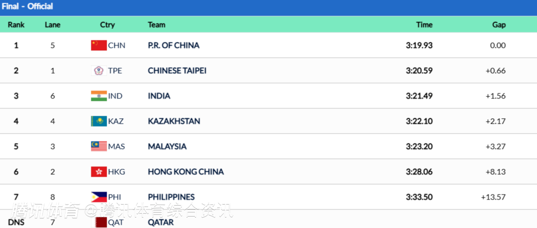 亚锦赛男子4x100米自由泳接力决赛:中国队3分19秒93 拿到金牌