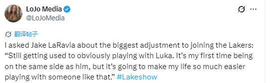 当被问及加盟湖人队后最大的适应挑战时,拉拉维亚表示:“显然,目前还在适应与东契奇并肩作战。这是我第一次和他成为队友,但和这样的球员一起打球,肯定会让我的比赛变得轻松很多。”