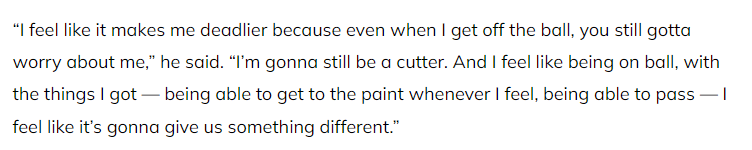 “我觉得这会让我更具威胁性,因为即便我不持球,对手也必须留意我的动向。我依旧会积极跑位切入。而且我认为,凭借自己持球时的能力,比如随时能突破到禁区,还有传球视野,我能为球队带来不一样的进攻选择。”
