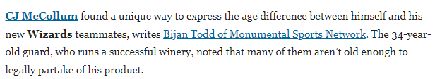 这些年轻球员包括20岁的二年级球员卡林顿和AJ-约翰逊,以及今年首轮新秀、19岁的特雷-约翰逊与威尔-莱利。麦科勒姆在今年夏天从新奥尔良被交易至奇才,球队希望他能担任年轻球员的导师,而他表示,指导过程早已开启。