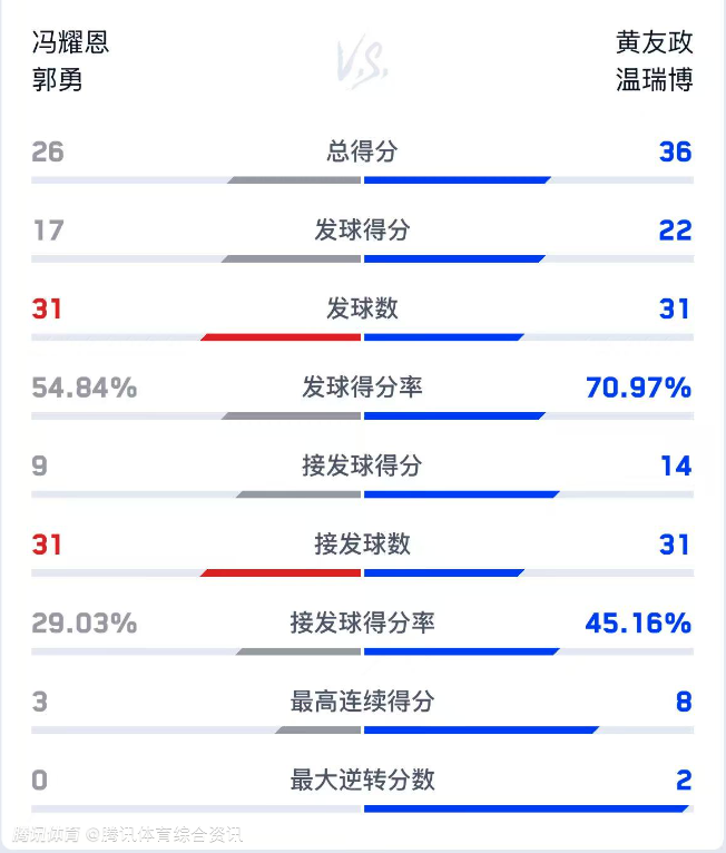 双方技术统计如下(温瑞博/黄友政在前):总得分36-26、发球得分22-17、发球得分率70.97%-54.84%