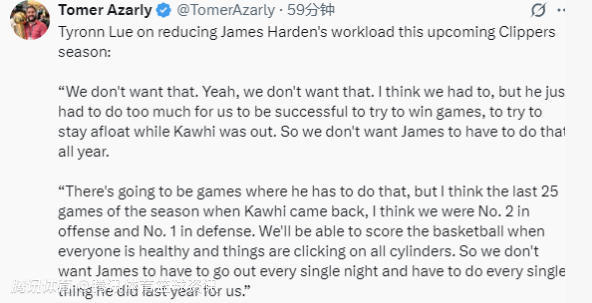 在谈到新赛季快船队会如何减轻哈登的负担时,泰伦-卢说道:“我们不希望再出现那种情况。对,就是不希望。我知道上赛季我们没办法,为了赢球、为了在莱昂纳德缺阵时撑住局面,他确实不得不承担太多。但我们不希望哈登一整年都这样。肯定还是会有一些比赛需要他站出来扛重担,但我记得上赛季莱昂纳德回归后的最后25场比赛,我们的进攻效率排在联盟第二,防守效率更是联盟第一。只要所有人都保持健康,球队各个环节都顺畅运转,我们的得分能力是有保障的。所以我们不希望哈登每晚都得像上赛季那样,什么事都得靠他一个人来扛。”