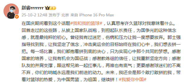 “在国庆期间看到这个话题我和我的篮球,认真思考许久篮球对我意味着什么。回首走过的这些路,从披上国家队战袍,到担起队长责任,为国争光的这种信念感,就是最纯粹的初心。”赵睿在社媒上写道。