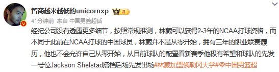 媒体人王健发文点评:经纪公司没有透露更多细节,按照常规推测,林葳可以获得2-3年的NCAA打球资格,而不同于此前在NCAA打球的中国球员,林葳并不是从零开始,拥有三年的职业联赛履历,他也不会允许自己从零开始,从目前球队的配置看新赛季他极有希望和球队的先发一号位Jackson Shelstad搭档后场先发出场