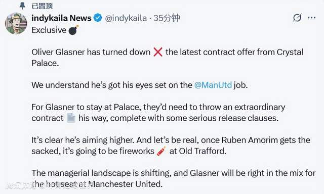 2025-10-02 18:202025-26赛季英超,水晶宫是唯一保持不败的球队,6战3胜3平积12分,排在第3位。水晶宫主帅格拉斯纳,展现出优秀的执教能力。10月2日,著名资讯账号indy kaila(球迷称呼为绿帽哥)独家爆料,格拉斯纳拒绝水晶宫的续约合同,他在等待曼联的召唤。