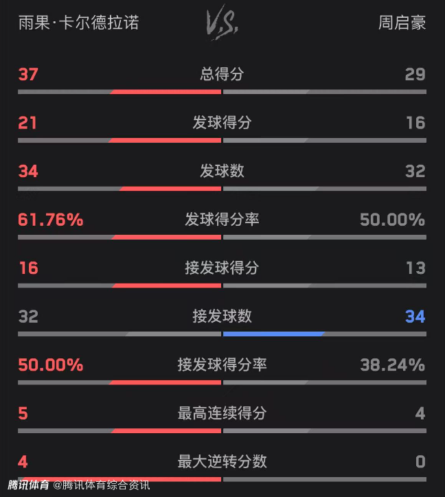 双方技术统计如下(周启豪在前):总得分29-37、发球得分16-21、发球得分率50%-61.76%。