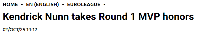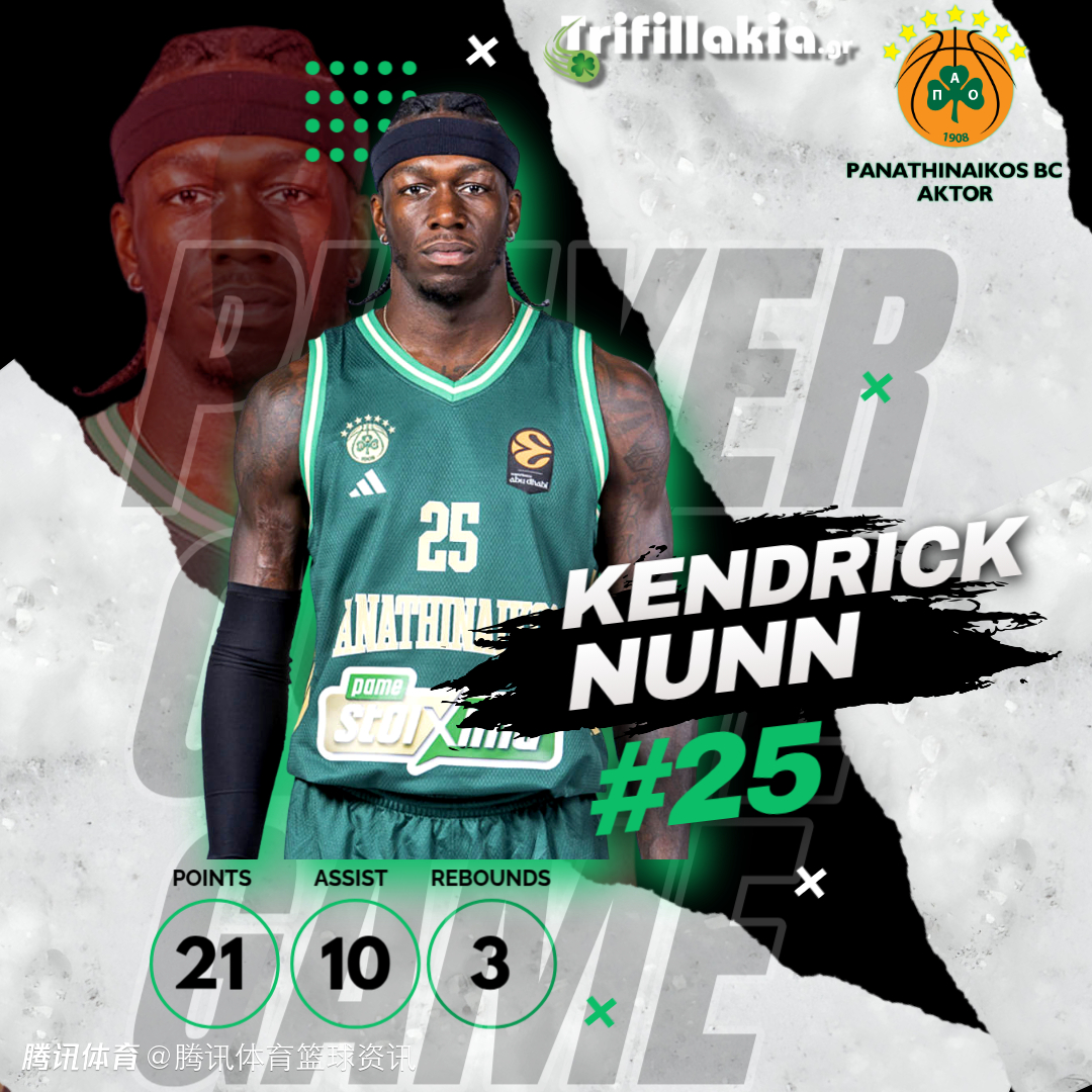 2025-10-02 21:10北京时间10月2日,凭借出色的个人表现及助力球队取胜的关键作用,雅典帕纳辛奈科斯队的肯德里克-纳恩当选2025-26赛季欧洲篮球冠军联赛首回合MVP。