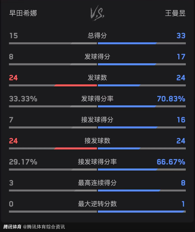 双方技术统计如下(王曼昱在前):总得分33-15、发球得分17-8、发球得分率70.83%-33.33%。