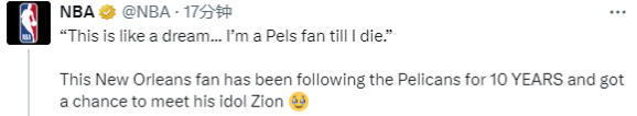 从视频中可以看到,这位球迷携带了一张简易海报,上面写着:“锡安是我的偶像。”而获得拥有见到锡安本人的机会,也让这位球迷非常激动,在锡安为他所身穿的球衣进行签名时,这位球迷的心情依然未能平复,嘴中还念念有词说道:“这简直像一场梦……我会做鹈鹕队的球迷,直到永远。”随后锡安还与这位球迷合影留念。