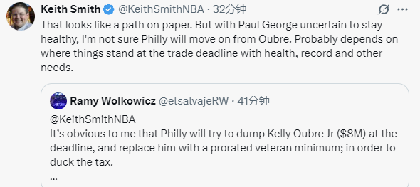 在谈到乌布雷时,Keith Smith表示:“从理论层面看,这似乎是一条可行之路。但由于保罗-乔治的健康状况存在不确定性,我不确定76人队是否会放弃乌布雷。最终结果很可能取决于到交易截止日时,球队的健康情况、战绩表现以及其他需求的满足程度。”