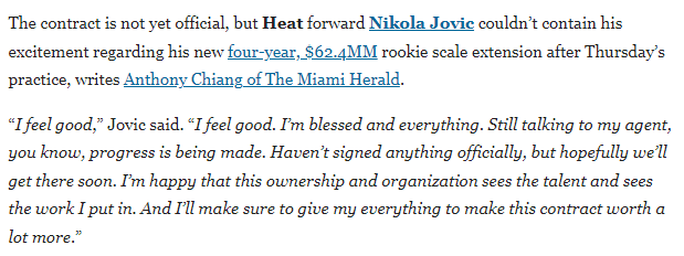 约维奇说道:“我感觉很棒,真的非常好,我心怀感恩。目前还在和经纪人沟通,谈判正在推进中。虽然还没有正式签署任何文件,但希望我们很快就能完成这一步。能得到球队管理层和整个组织对我天赋的认可,以及对我付出努力的肯定,我非常开心。我会全力以赴,让这份合同的价值得到更大的体现。”