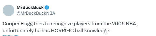 2025-10-03 10:10北京时间10月3日,独行侠状元秀库珀-弗拉格参与一项趣味挑战,辨认自己出生年份(2006年)的NBA球星卡包球员,最终结果却展现出新生代球员与联盟过往球星的“认知代沟”。