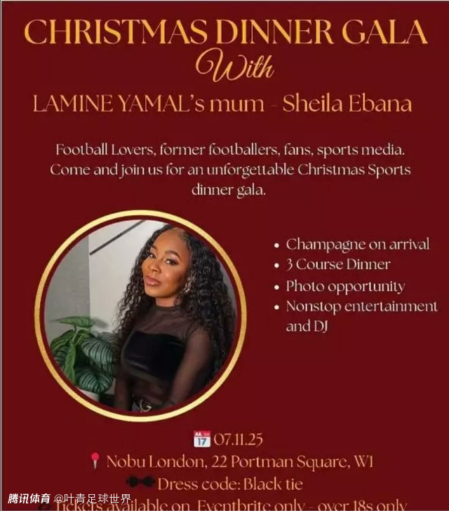 《马卡报》等媒体报道,亚马尔母亲Sheila Ebana将出席一场晚宴,时间定在11月7日,地点是伦敦Nobu酒店。作为晚宴的明星、主办人,Sheila Ebana制定了3档票价: