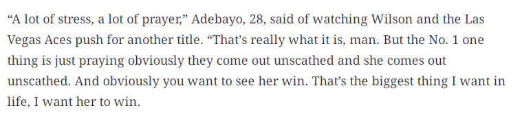 阿德巴约在谈及观看威尔逊与王牌队冲击又一座冠军时说道:“心里满是紧张,也一直在祈祷,说实话就是这种感觉。但最重要的显然是祈祷她们能顺利比赛,她也能毫发无伤。而且很明显,你会希望看到她赢,这是我人生中最想看到的事之一,我希望她能夺冠。”