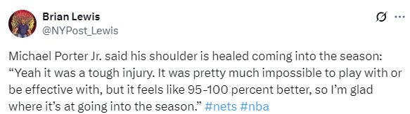 2025-10-03 11:30北京时间10月3日,篮网队球员小迈克尔-波特接受媒体采访,谈到了自己的肩伤恢复情况,并透露自己的肩伤已经恢复了95%到100%。