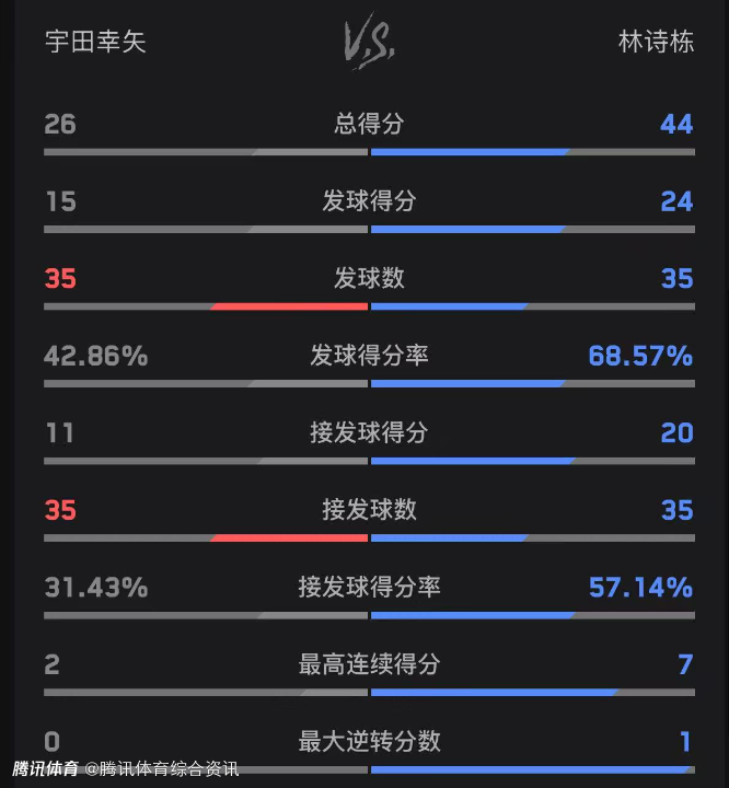 双方技术统计如下(林诗栋在前):总得分44-26、发球得分24-15、发球得分率68.57%-42.86%。