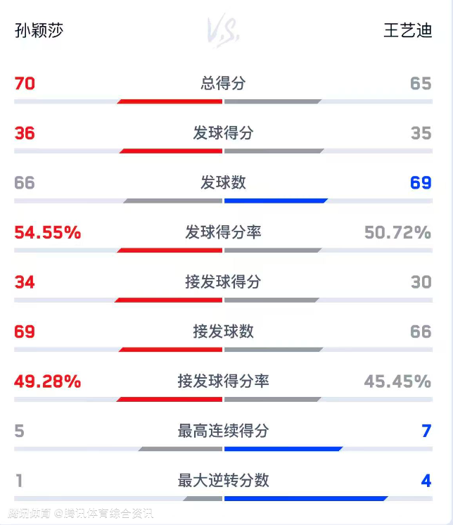 双方技术统计如下(孙颖莎在前):总得分70-65、发球得分36-35、发球得分率54.55%-50.72%