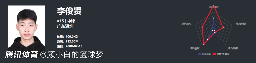 本次U17联赛,李俊贤场均26分钟,拿到17分10.7篮板(其中3.7个前场篮板)0.7助攻0.3抢断1.3盖帽,命中率高达70%,罚球命中率66.7%,虽然李俊贤三分出手很少但这个孩子能投三分,只要敢完全放他,他是真能投。