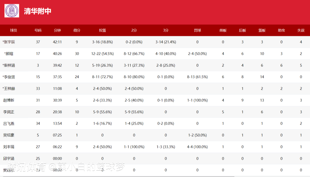 这场比赛清华附中赢球的功臣有两人,郝煊40分钟,22中12+三分10中4拿到30分10篮板3助攻,李俊贤38分钟,11中8,罚球13中8,拿到24分14篮板1盖帽,这两人太不容易了。
