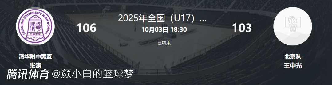 2025-10-04 00:50北京时间10月3日,2025年U17篮球联赛,清华附中106-103险胜北京队,这场比赛北京队在一度落后15分的情况下奋起直追,第三节北京队打出23-3的攻防浪潮一举反超,末节清华附中回敬一波22-11拖入加时赛,最终清华附中鏖战双加时涉险过关。