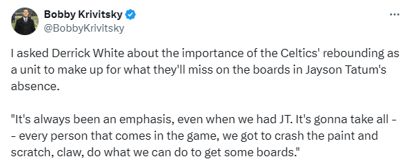 当被问及塔图姆缺阵期间,球队需靠团队篮板能力弥补损失的重要性时,怀特强调篮板始终是球队核心重点:“篮板球一直是我们球队反复强调的关键,就算塔图姆在队里,我们也同样重视。现在他暂时无法上场,就更需要所有人拧成一股绳 ,每一个获得出场机会的球员,都必须全力冲击禁区,拿出百分百的拼劲,尽自己所能去争抢每一个篮板球。”