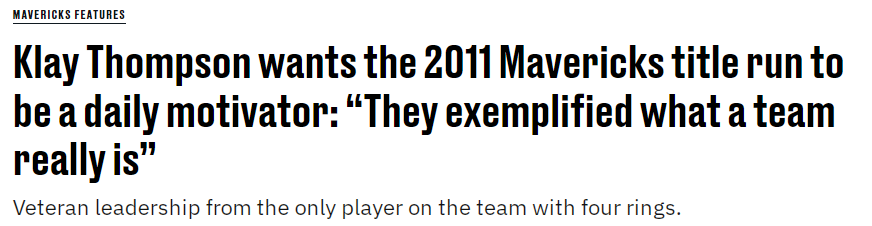克莱说道:“我经常看2011年夺冠的纪录片,对那次夺冠征程的记忆特别清晰。我还记得诺维茨基、特里、马里昂的表现,还有基德掌控全场的样子。所有和我同龄的NBA球迷,都会对那次征程印象深刻,因为那支球队或许不是季后赛里天赋最顶尖的,但他们诠释了团队的真正意义。队里每个球员都清楚自己的角色,知道谁是终结者,知道自己在哪些位置发挥最好。这太激励我了,这正是我想要的,我渴望再次拥有这样的团队体验。”