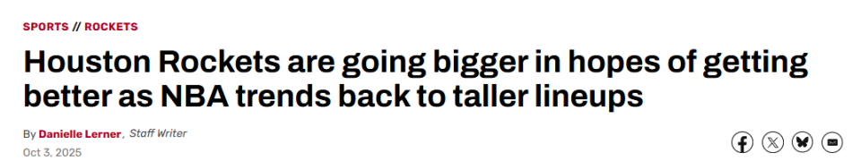“不过我们是第一个这么做的!”亚当斯在火箭队训练营中说道,“我们是潮流引领者。”亚当斯随后坦言这是玩笑话——火箭队启用双塔阵容,实则是对2月份负于独行侠队的回应。当时独行侠队的浓眉与加福德这对中锋组合,将火箭队彻底压制。申京与亚当斯的搭档效果远超预期,尤其在火箭队季后赛对阵勇士队的系列赛中表现出色。因此本赛季,火箭队将进一步采用以身体对抗为核心的“强硬打法”,甚至考虑使用“死亡五大”阵容。
