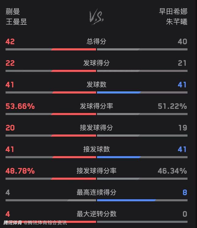 双方技术统计如下(王曼昱/蒯曼在前):总得分42-40、发球得分22-21、发球得分率53.66%-51.22%。
