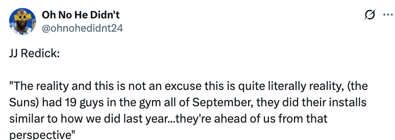 另外,雷迪克要求湖人队今晚要跑起来、积极沟通并全力竞争,他对球队大部分时间的跑动表现感到满意,但表示另外两点还需要改进,他说道:“现实情况是,这不是借口,而完全是客观事实,太阳整个9月都有19名球员在训练馆投入训练,他们像我们去年那样完成了战术体系的磨合,从这个角度来说,他们目前比我们更具优势。”