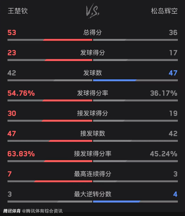 双方技术统计如下(王楚钦在前):总得分53-36、发球得分23-17、发球得分率54.76%-36.17%。