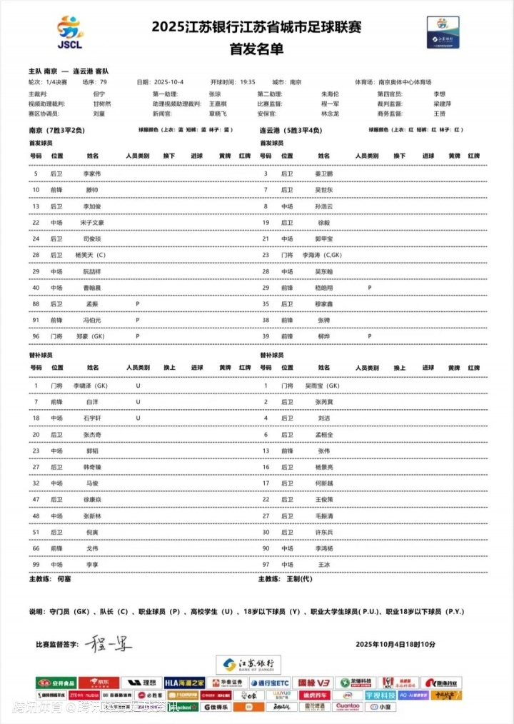 2025-10-04 19:00北京时间10月4日,“苏超”首轮淘汰赛今晚打响,南京队与连云港队的首发阵容出炉,其中现效力于中超青岛海牛队的冯伯元进入南京队首发名单。