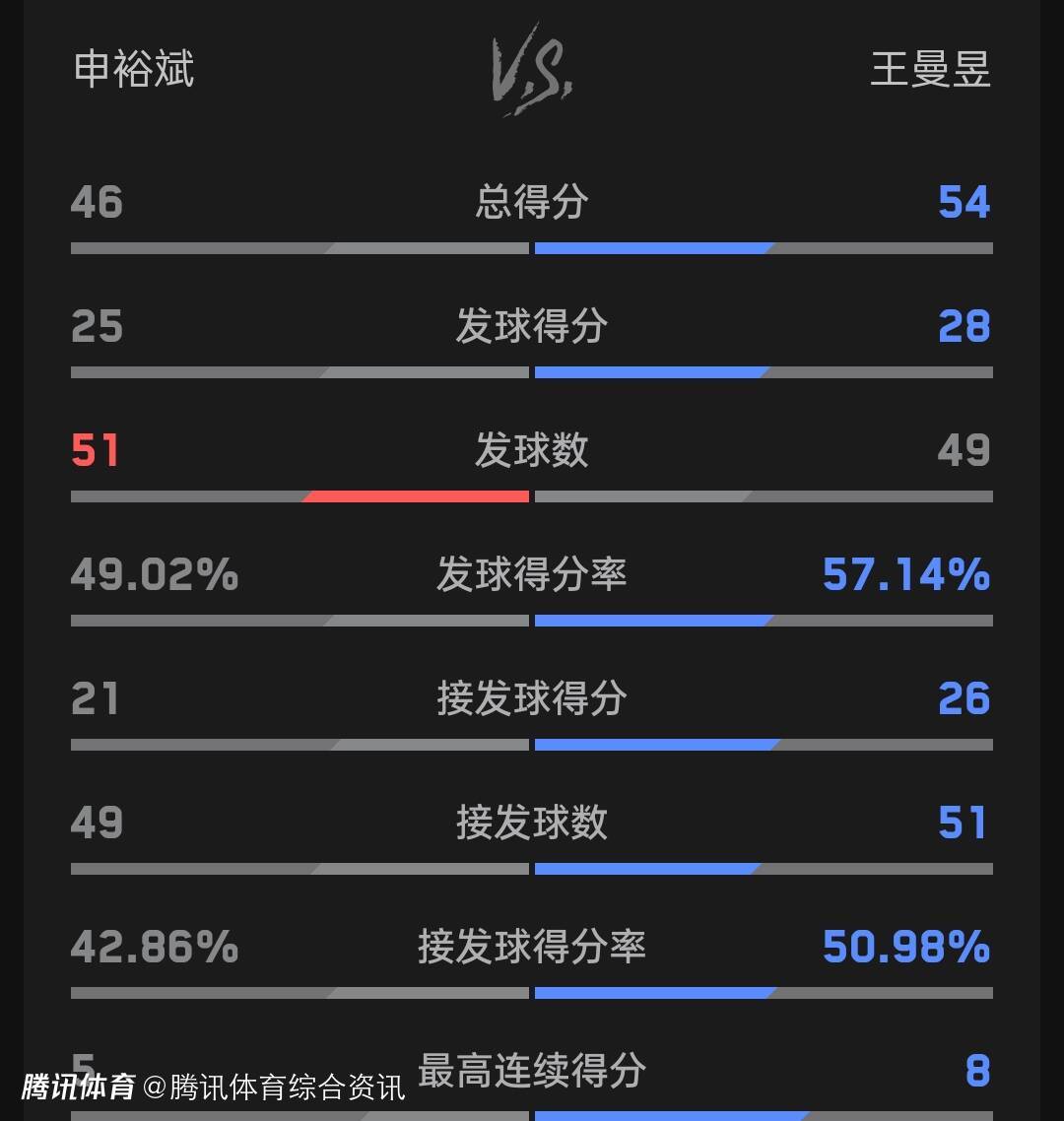 双方技术统计如下(王曼昱在后):总得分46-54,发球得分25-28,发球得分率49.02%-57.14%